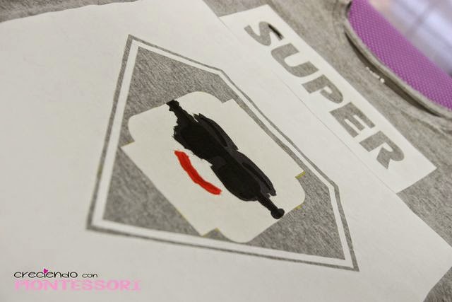 Cómo tuvimos un percance, y se nos manchó un poco la camiseta con una pincelada, al final añadimos la palabra Super (que no estaba prevista) y el escudo de Super Man, al final quedó todavía más bonita que como habíamos pensado en un principio!