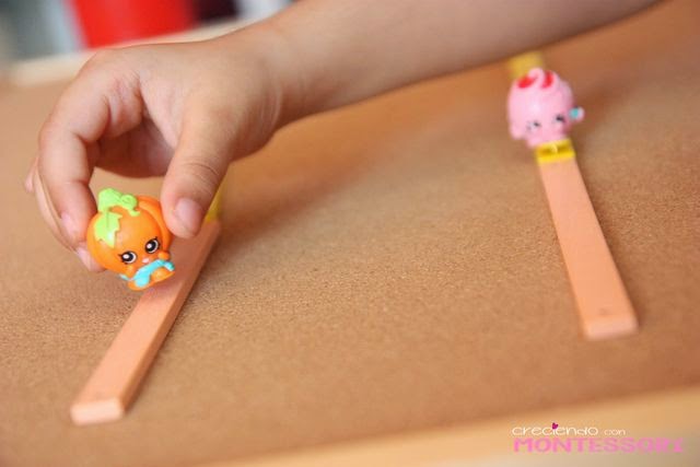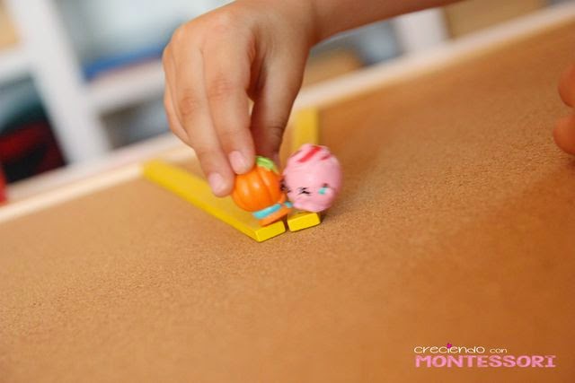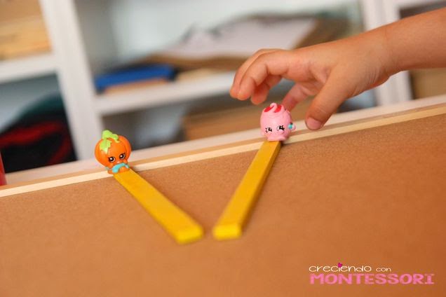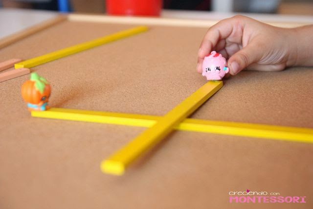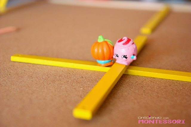 Hemos estado viendo las rectas secantes y las rectas paralelas con el material geométrico Montessori, contamos una historia en la que Shopkin Calabaza va en busca de Shopkin Merengue rosa. Si van por el camino que dibujan dos lineas paralelas no se encontraran nunca :-(